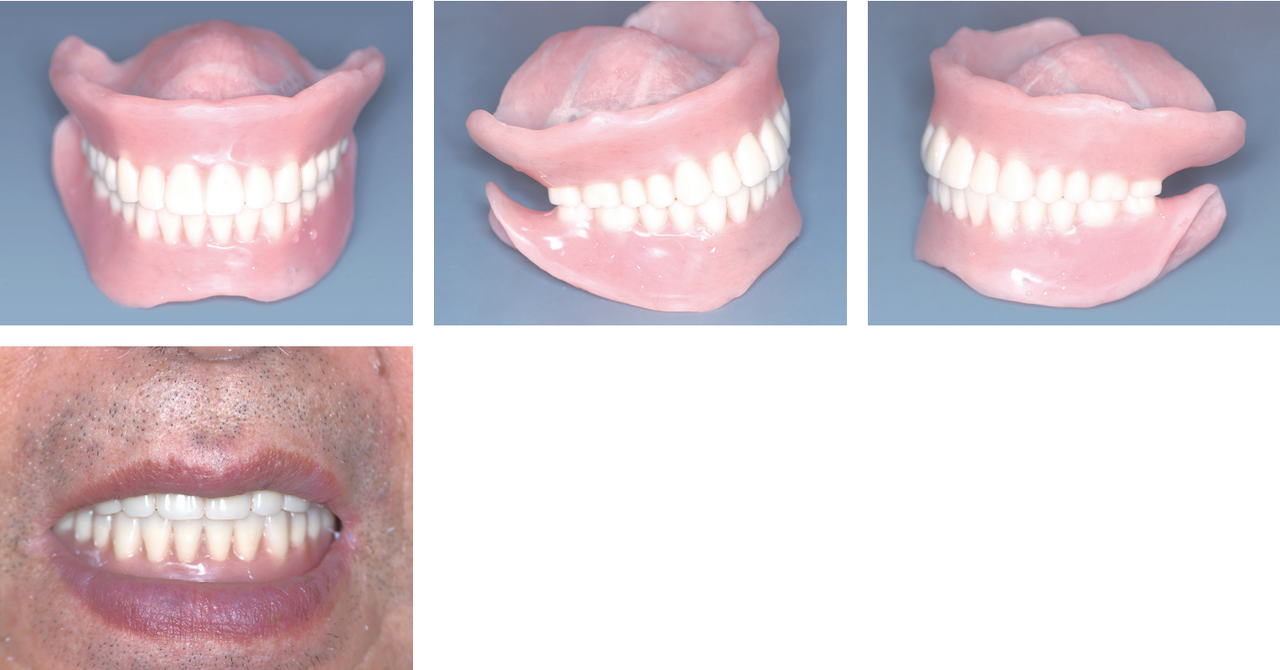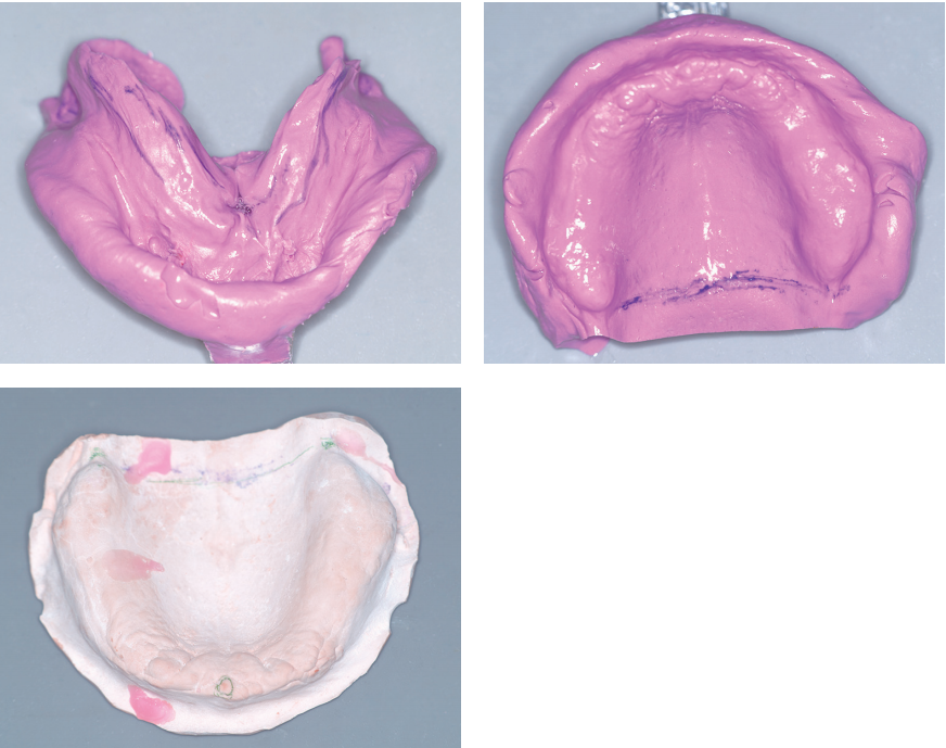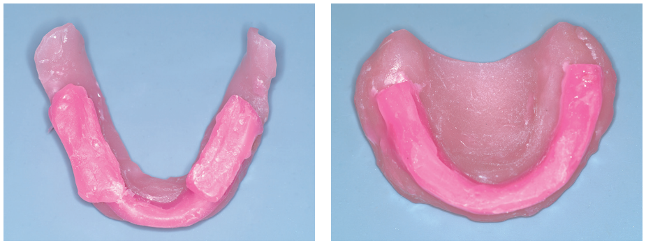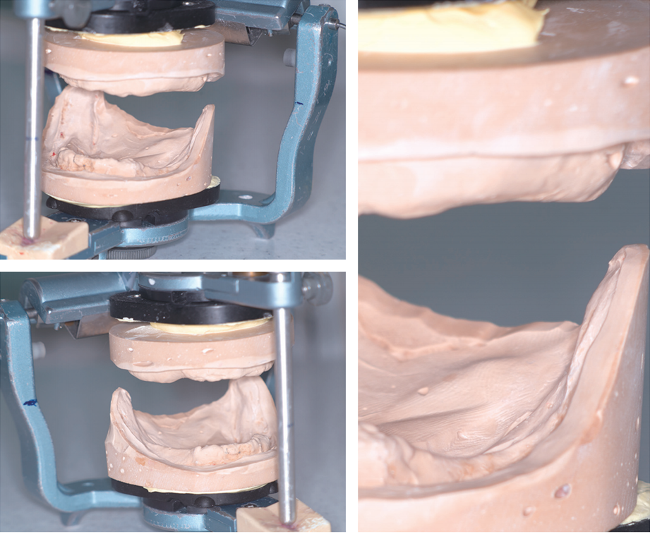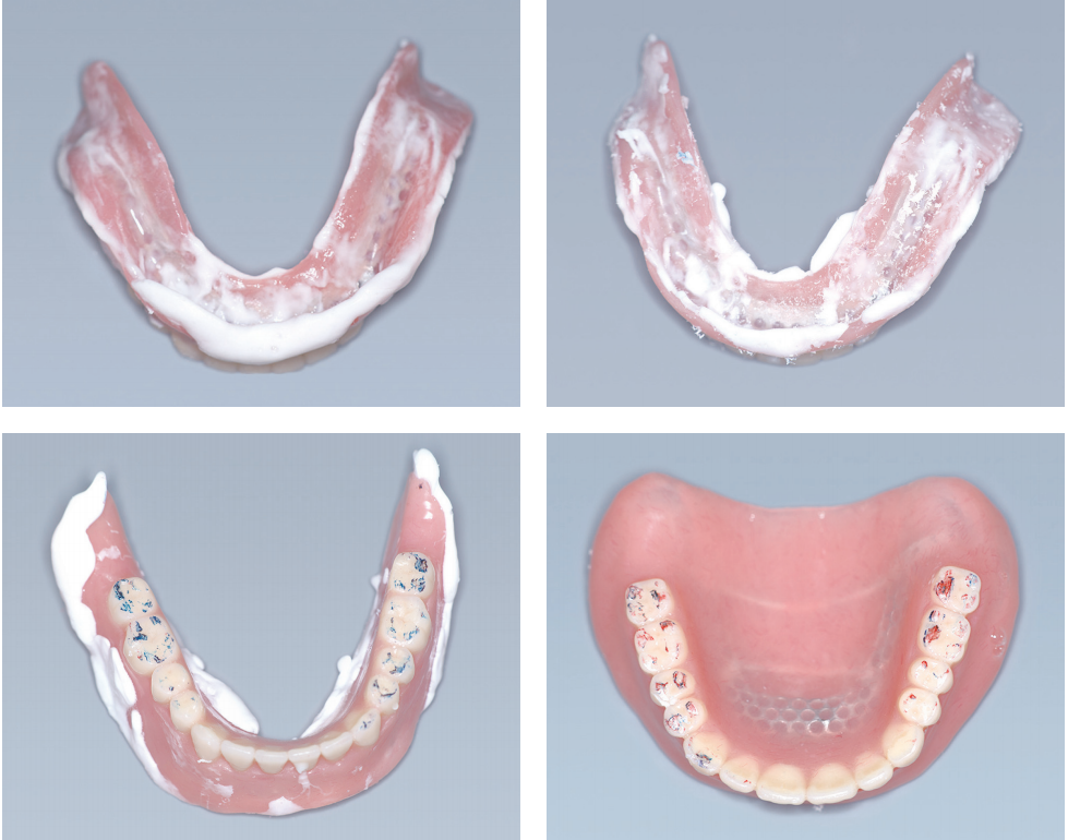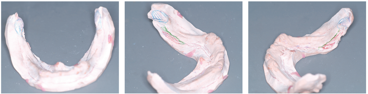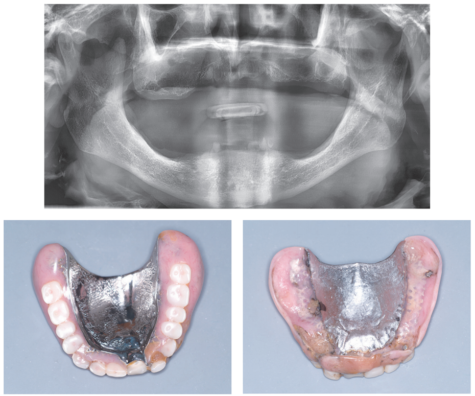 파노라마 사진과 모델 진단에서 Kelly’ combination syndrome 상태를 확인하였다. 이런 증례에서는 완성 틀니 장착 후 하악 구치부에서 지속적인 통증을 호소한다.