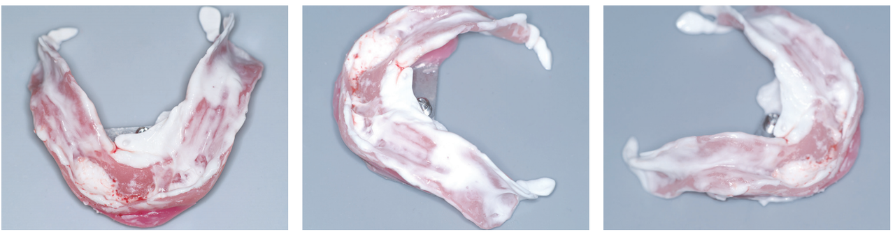 하악 구치부 치조제 상태가 너무 열악합니다. 특히 하악 좌측 구치부 치조정 형태는 음형 상태이고 유리치은이 치조제 대부분을 차지하고 있습니다. 혼수비를 줄여서 잇몸을 압박하는 인상이 필요합니다.