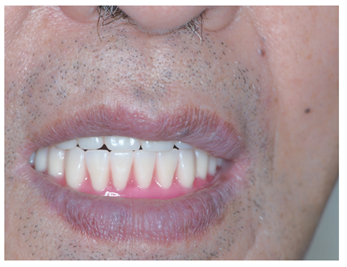 상악 전치부 배열 상태는 양호하다. 하악 전치부가 치은 부위까지 보인다. VD를 하악에서만 3mm 낮추기로 하였다.