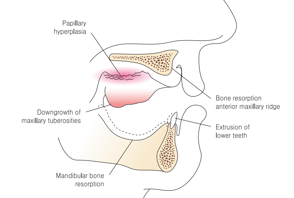 상악이 무치악 상태이고 하악은 전치부만 남아 있는 상태가 오랫동안 지속되었을 때 구강 내에서 일어나는 변화들이다. 다음 그림에서 보이는 것처럼 여러 부위에서 퇴행성 변화가 일어난다.