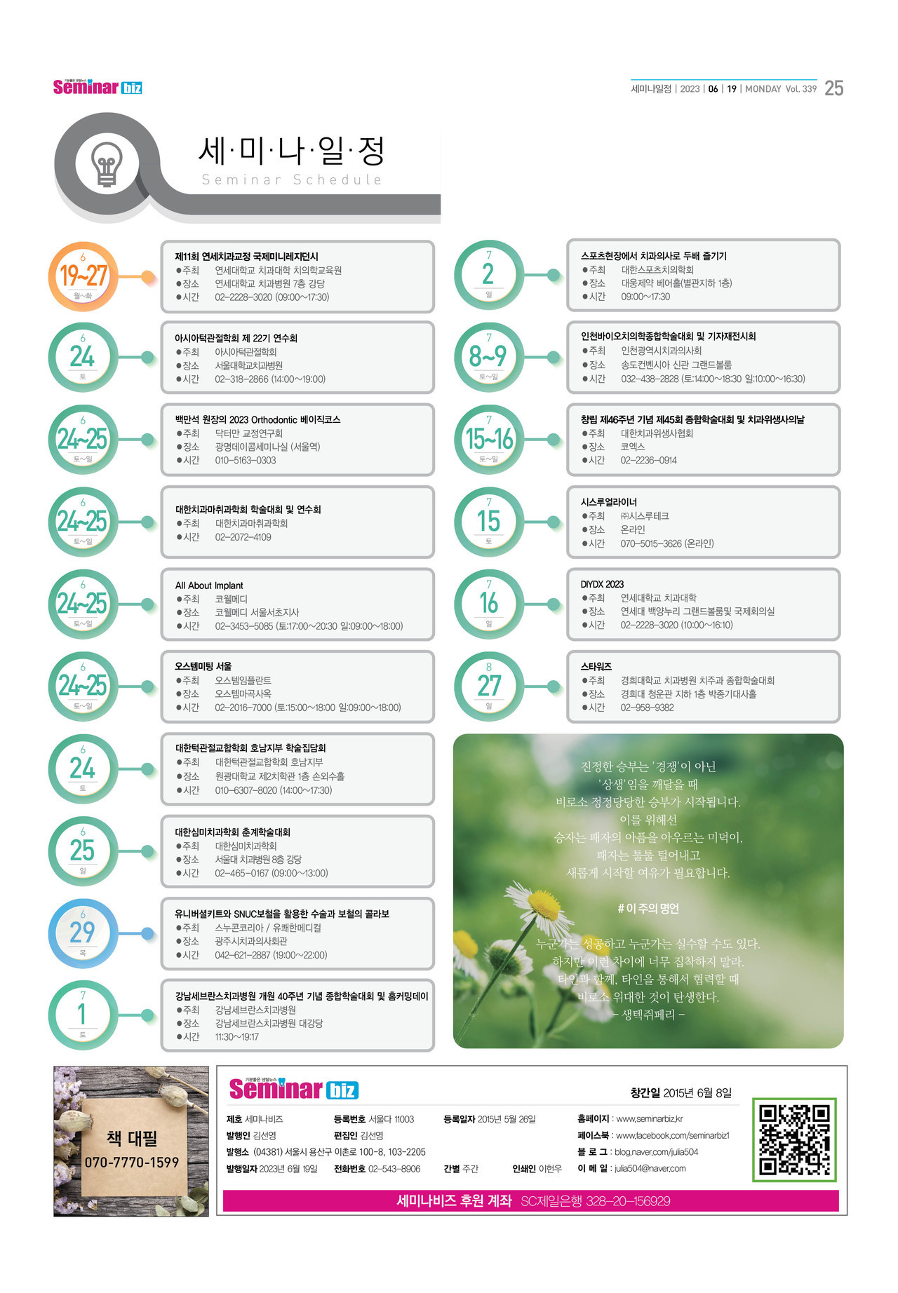 좋아요1훈훈해요0슬퍼요0후속기사 원해요0 키워드 #아시아턱관절학회 #연세치과교정 국제미니레지던시 #대한스포츠치의학회 #인천바이오치의학종합학술대회 #대한치과위생사협회 #오스템미팅 #대한턱관절교합학회 #강남세브란스치과병원 #치과뉴스 #세미나비즈 #스타워즈 #치과의사 #치과의사세미나 세미나비즈 webmaster@seminarbiz.kr 다른기사 보기 저작권자 © 덴탈뉴스 무단전재 및 재배포 금지 당신만 안 본 뉴스 [알파베러정재욱대표] 좋은 제품 검증된 제품만 모은 알파베러 유한 evertis 임플란트 성공 위한 워크샵 진행 “미용치과 안티에이징이 치과의 블루오션” 덴탈스튜디오, 블랙니들홀더 출시 서울대학교치과병원, 키르기스스탄 장애 어린이위한 사랑의 의료봉사 펼쳐 연송캠퍼스 개관10주년 기념식 및 SID 명예의 전당 제막식 네오바이오텍, 즉시로딩 임플란트 ALX-IT 11월 세미나 전국 진행 [알파베러정재욱대표] 좋은 제품 검증된 제품만 모은 알파베러 개의 댓글 회원로그인 작성자 비밀번호 댓글 내용입력 댓글 정렬 최신순 추천순 답글순 BEST댓글 BEST 댓글 답글과 추천수를 합산하여 자동으로 노출됩니다. 닫기 더보기 댓글삭제 삭제한 댓글은 다시 복구할 수 없습니다. 그래도 삭제하시겠습니까? 비밀번호 닫기 댓글수정 댓글 수정은 작성 후 1분내에만 가능합니다. 본문 / 400 비밀번호 닫기 내 댓글 모음 닫기 주요기사 중국 의료기기 1등급 인허가 취득 점빵치과 고민! 한자리서 해결 완성도높은 투명교정 솔루션 나노라이너 치과의사들의 만성고민 해결 신경치료가 혈당과 지방대사까지 개선 골이식 전략과 덴티움 제품 활용 노하우 공유