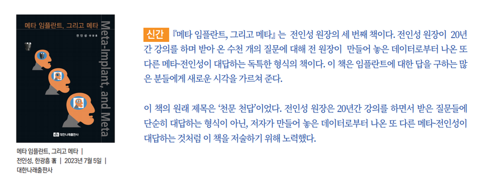 [신간] 『메타 임플란트, 그리고 메타』 는 전인성 원장의 세 번째 책이다. 전인성 원장이 20년간 강의를 하며 받아 온 수천 개의 질문에 대해 전 원장이 만들어 놓은 데이터로부터 나온 또 다른 메타-전인성이 대답하는 독특한 형식의 책이다. 이 책은 임플란트에 대한 답을 구하는 많은 분들에게 새로운 시각을 가르쳐준다.