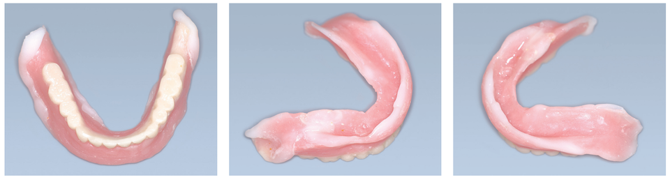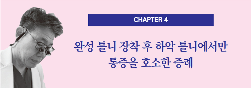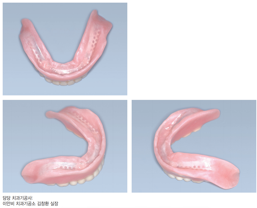 환자는 식사할 때 하악 틀니에서 잇몸 통증이 심하다고 호소하였다.