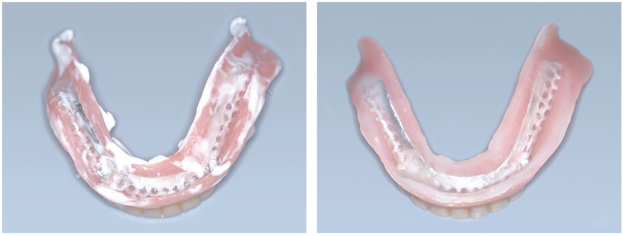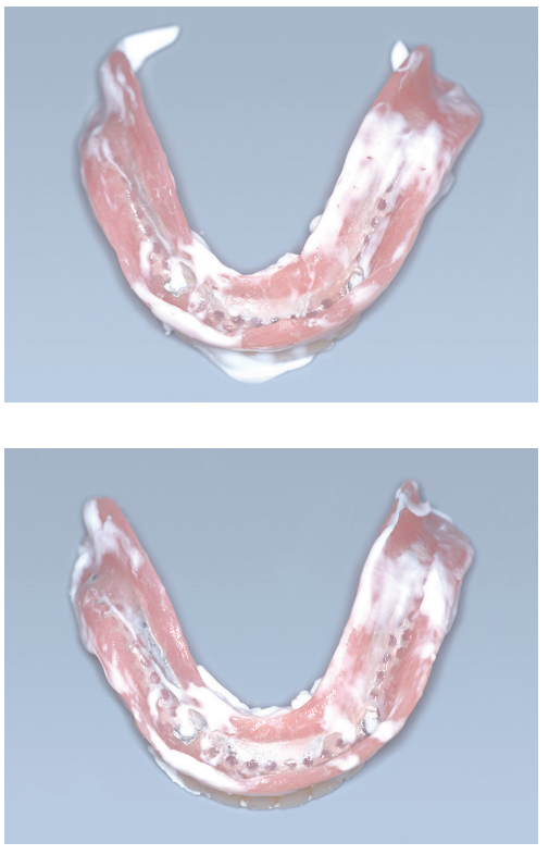 하악 틀니 인상면 전부를 2mm 정도 삭제한 후 tissue conditioner를 이용하여 2차 기능인상을 실시하였다.