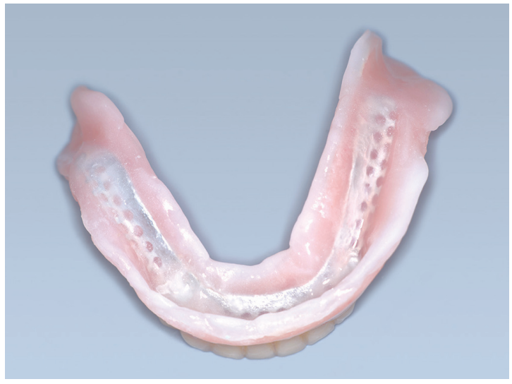 기능인상이 완성된 하악 틀니 내면에 top coat coating 후 치과기공소에 relining을 의뢰하였다.