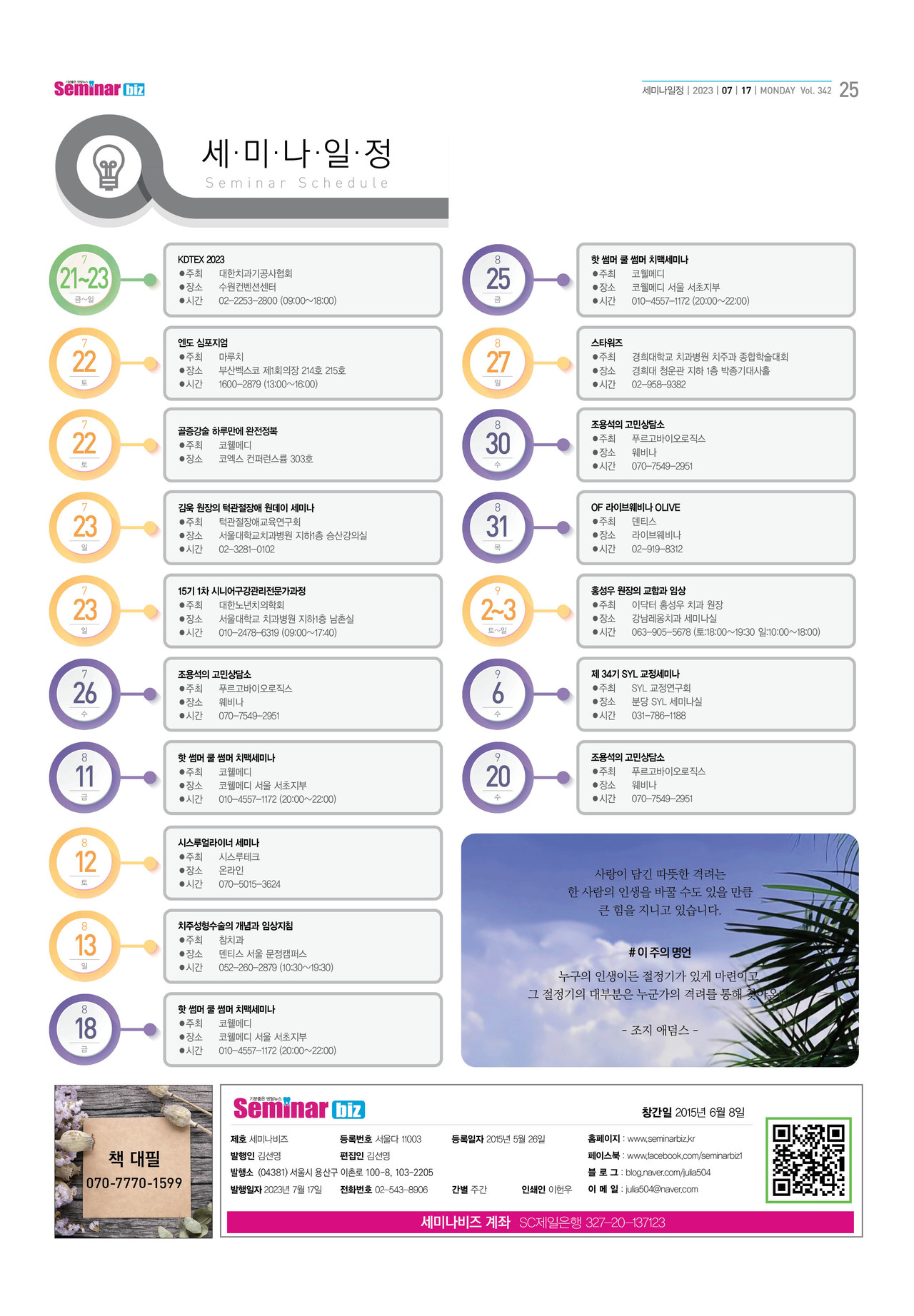좋아요1훈훈해요0슬퍼요0후속기사 원해요0 키워드 #KDTEX2023 #대한치과기공사협회학술대회 #시스루얼라이너 #조용석의 고민상담소 #STL교정연구소 #턱관절세미나 #홍성우원장 #교합세미나 #엔도심포지엄 #세미나비즈 #치과의사 #치과학회 세미나비즈 webmaster@seminarbiz.kr 다른기사 보기 저작권자 © 덴탈뉴스 무단전재 및 재배포 금지 당신만 안 본 뉴스 [알파베러정재욱대표] 좋은 제품 검증된 제품만 모은 알파베러 유한 evertis 임플란트 성공 위한 워크샵 진행 “미용치과 안티에이징이 치과의 블루오션” 덴탈스튜디오, 블랙니들홀더 출시 서울대학교치과병원, 키르기스스탄 장애 어린이위한 사랑의 의료봉사 펼쳐 연송캠퍼스 개관10주년 기념식 및 SID 명예의 전당 제막식 네오바이오텍, 즉시로딩 임플란트 ALX-IT 11월 세미나 전국 진행 [알파베러정재욱대표] 좋은 제품 검증된 제품만 모은 알파베러 개의 댓글 회원로그인 작성자 비밀번호 댓글 내용입력 댓글 정렬 최신순 추천순 답글순 BEST댓글 BEST 댓글 답글과 추천수를 합산하여 자동으로 노출됩니다. 닫기 더보기 댓글삭제 삭제한 댓글은 다시 복구할 수 없습니다. 그래도 삭제하시겠습니까? 비밀번호 닫기 댓글수정 댓글 수정은 작성 후 1분내에만 가능합니다. 본문 / 400 비밀번호 닫기 내 댓글 모음 닫기 주요기사 중국 의료기기 1등급 인허가 취득 점빵치과 고민! 한자리서 해결 완성도높은 투명교정 솔루션 나노라이너 치과의사들의 만성고민 해결 신경치료가 혈당과 지방대사까지 개선 골이식 전략과 덴티움 제품 활용 노하우 공유