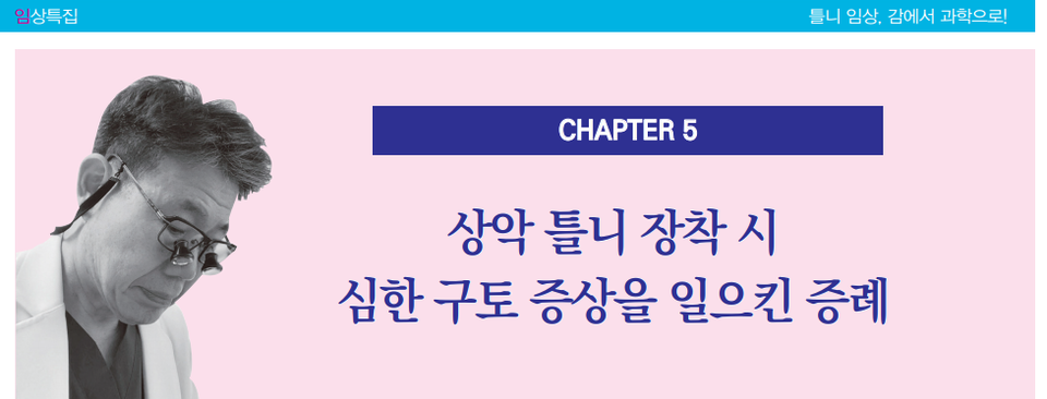 완성 틀니를 낄 때 구토 증상을 호소하는 경우는 정말 드물다. 필자도 심인성 구토 환자는 처음 겪는 일이라 마음이 쓰였다. 함께 오는 아들에게도 간곡히 부탁을 드렸다.