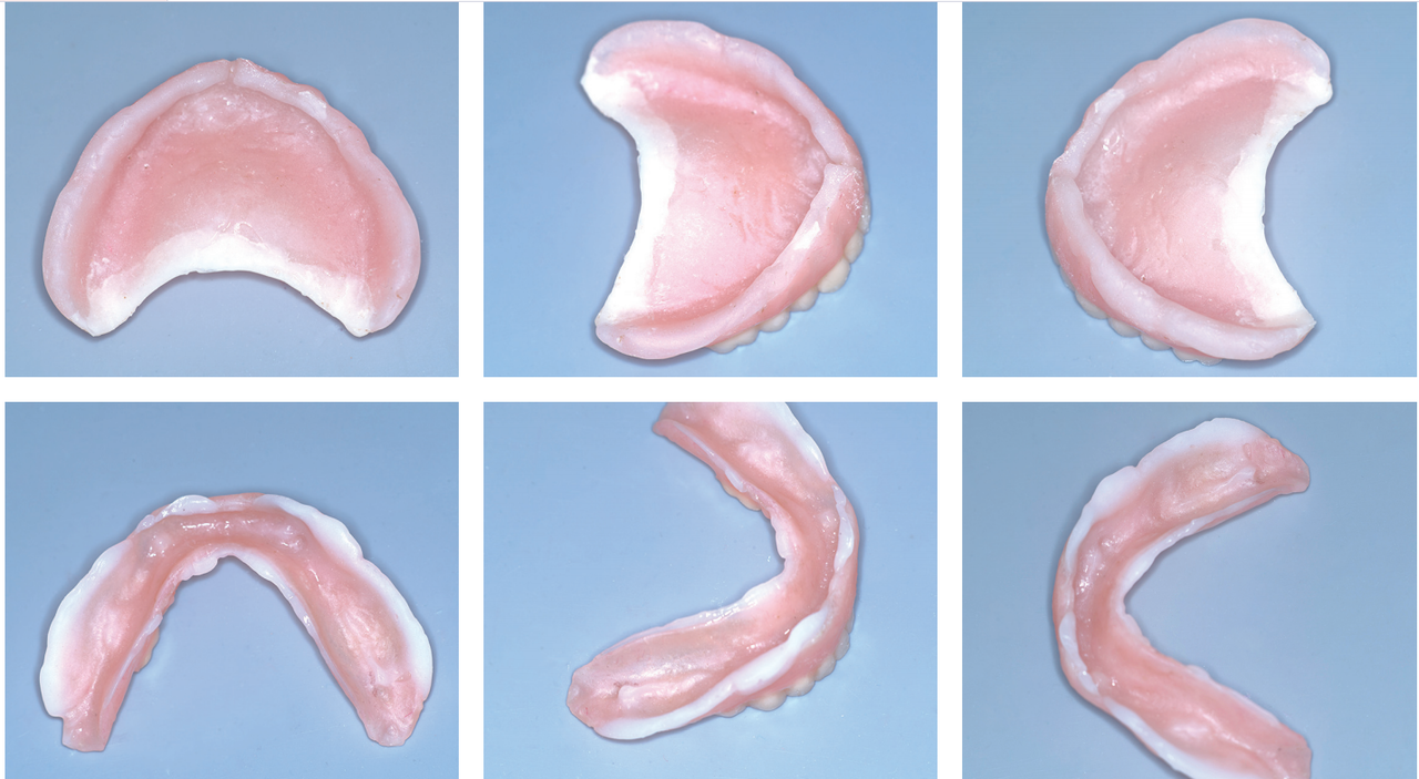 틀니 후방 부위를 5mm 정도 삭제한 후 temporary resin을 첨가하였다. 1mm 정도씩 삭제를 하면서 구토 증상을 일으키지 않는 범위까지 삭제하였다. 남은 temporary resin 부위를 knife edge 형태로 얇고 매끄럽게 조정하였다.