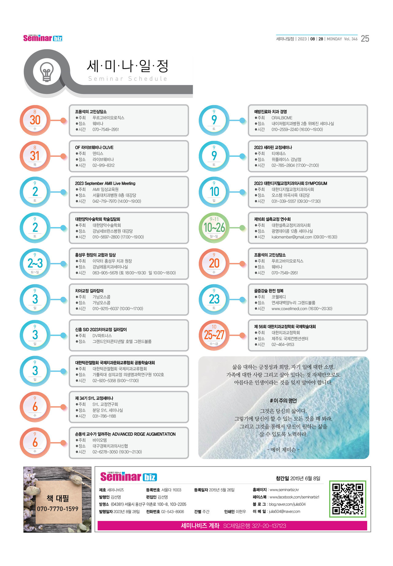 좋아요1훈훈해요0슬퍼요0후속기사 원해요0 키워드 #조용석의 고민상담소 #대한양악수술학회 #홍성우원장 #치아교정길라잡이 #대한턱관절교합학회 #손동석교수 #바이오템세미나 #세라핀교정세미나 #대한디지털교정피과의사회 #설측교정연수회 #세미나비즈 세미나비즈 webmaster@seminarbiz.kr 다른기사 보기 저작권자 © 덴탈뉴스 무단전재 및 재배포 금지 당신만 안 본 뉴스 [알파베러정재욱대표] 좋은 제품 검증된 제품만 모은 알파베러 유한 evertis 임플란트 성공 위한 워크샵 진행 “미용치과 안티에이징이 치과의 블루오션” 덴탈스튜디오, 블랙니들홀더 출시 서울대학교치과병원, 키르기스스탄 장애 어린이위한 사랑의 의료봉사 펼쳐 연송캠퍼스 개관10주년 기념식 및 SID 명예의 전당 제막식 네오바이오텍, 즉시로딩 임플란트 ALX-IT 11월 세미나 전국 진행 [알파베러정재욱대표] 좋은 제품 검증된 제품만 모은 알파베러 개의 댓글 회원로그인 작성자 비밀번호 댓글 내용입력 댓글 정렬 최신순 추천순 답글순 BEST댓글 BEST 댓글 답글과 추천수를 합산하여 자동으로 노출됩니다. 닫기 더보기 댓글삭제 삭제한 댓글은 다시 복구할 수 없습니다. 그래도 삭제하시겠습니까? 비밀번호 닫기 댓글수정 댓글 수정은 작성 후 1분내에만 가능합니다. 본문 / 400 비밀번호 닫기 내 댓글 모음 닫기 주요기사 중국 의료기기 1등급 인허가 취득 점빵치과 고민! 한자리서 해결 완성도높은 투명교정 솔루션 나노라이너 치과의사들의 만성고민 해결 신경치료가 혈당과 지방대사까지 개선 골이식 전략과 덴티움 제품 활용 노하우 공유