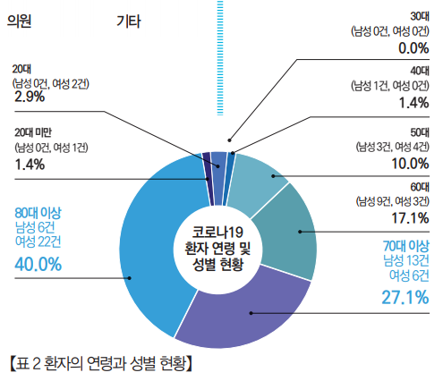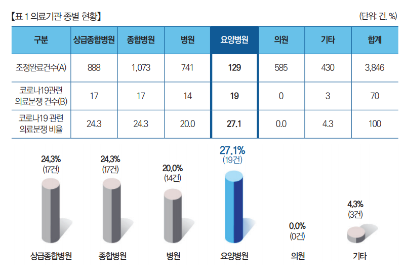 코로나 19 의료분쟁 사건을 분석한 결과 보건의료기관 종별현황으로는 ‘요양병원’에서 27.1%(19건)로 가장 많이 발생했고, 연령별로는 ‘80대 이상’에서 40%(28건)로 높은 비중을 차지했다. [표1 참조]