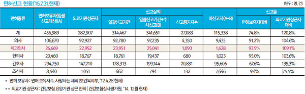 정부는 의료인의 면허발급 이후 지속적질 관리를 위해 2012년 3월부터 ‘의료인 면허신고제도’를 시행해 오고 있다. 2015년 7월말 기준으로 의사 면허신고율 91%, 치과의사 94%로 환자 진료업무에 종사하는 의료인은 대부분 보수교육을 이수하고 있는 것으로 파악되고 있다.