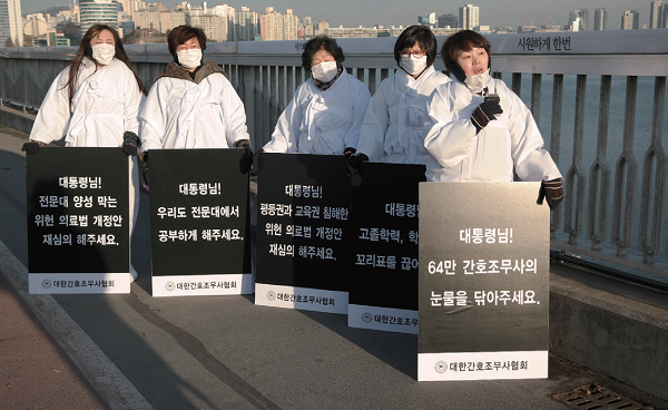 한편, 간호사 전문대 양성금지법안에 대한 항의시위는 계속 진행되고 있다. 지난 6일 간호조무사 임상대표자들이 마포대교위에서 보복시위를 벌였다.