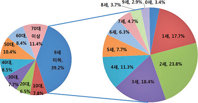 연령별로 보면 9세 이하 진료인원이 전체 진료인원의 약 40%에 달했으며, 영·유아에 해당하는 0~6세 환아들이 9세진료인원의 88.6%를 차지했다.