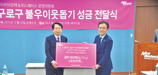 ㈜네오바이오텍(대표 허영구·김인호, 이하 네오)이 올해도 사회공헌활동 선두 기업다운 활동으로 매서운 추위를 훈훈하게 달궜다.