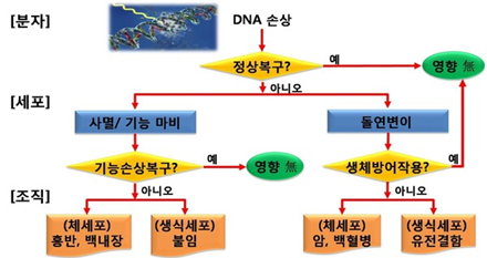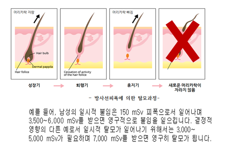 방사선 피폭이 인체에 미치는 영향에는 확정적영향과 확률적영향이 있다(아래그림). 확정적 영향은 어느 피폭선량 이하(문턱값)에서는 영향(장해)이 발생하지 않지만 그 선량을 넘으면 장해가 발현하기 시작하는데 장해정도는 피폭량에 비례하여 2차 함수적으로 나타난다는 것이다.