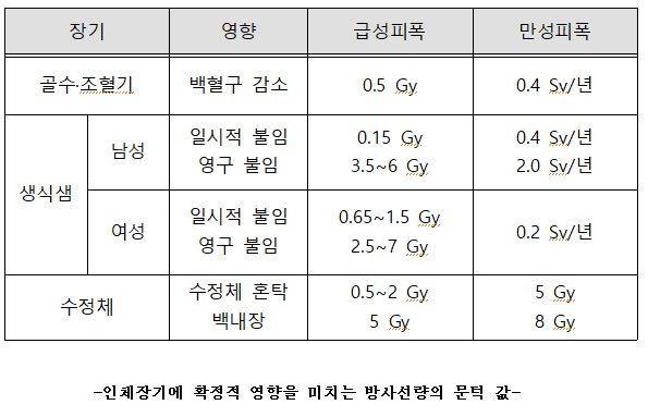 이 중에서 급성 방사선장해와 백내장은 확정적영향이다. 또한 LNT가설에 의해 발암과 유전적 영향을 확률적영향이라 할 수 있다. 급성장해와 만성장해는 각각 고선량에 피폭된 경우와 저선량에 피폭된 경우로 나누어 생각해야 한다.