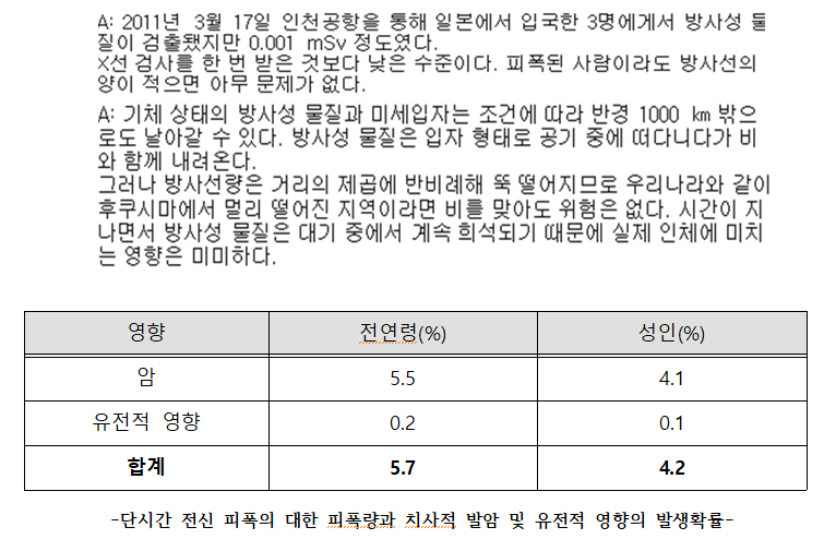단시간에 1Sv의 방사선에 피폭되면 치사적 발암확률이 5.5% 증가하는데 이 확률은 피폭량(실효선량)에 비례한다고 한다. 따라서 100mSv에서는 0.55% 비율로 된다. 국가암정보센터에 따르면 우리나라에서 2013년 기준으로 모든 암의 발생률은 인구 10만 명당 1년에 445.7명(남자 449.9명, 여자 441.5명)이었다. 이웃한 일본의 경우 2011년 일본의 인구동태 통계(후생노동성)에서 암으로 사망하는 비율은 남성이 32.5%, 여성은 24.2%이다.