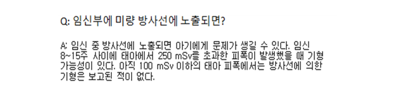 하지만 태아에서의 방사선 피폭은 방사선에 대한 감수성이 높으므로(특히 임신초기에 높다) 기형 발생에 대한 문턱값을 100mSv정도로 설정하고 있다.