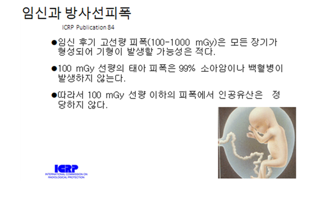 ICRP는 ‘ICRP 보고서 90(2003a)’에서 배아 및 태아피폭에 관해 다음과 같은 결론에 도달했다(ICRP Publication 103, 2007년 보고에서도 같음).