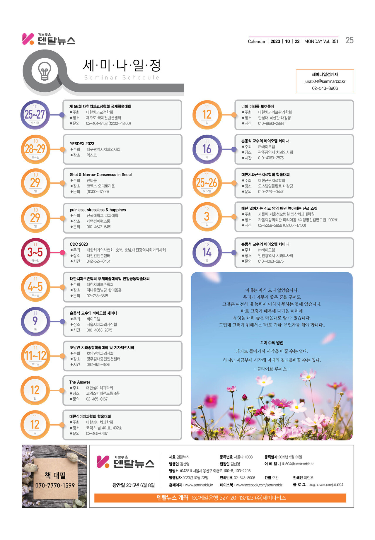 10월 25일부터~27일까지 대한치과교정학회학술대회 좋아요1훈훈해요0슬퍼요0후속기사 원해요0 키워드 #덴탈뉴스 #대한치과교정학회 #대한치과보철학회 #대한치과의료관리학회 #바이오템세미나 #대한치과근관치료학회 #치과뉴스 덴탈뉴스 webmaster@seminarbiz.kr 다른기사 보기 저작권자 © 덴탈뉴스 무단전재 및 재배포 금지 당신만 안 본 뉴스 [알파베러정재욱대표] 좋은 제품 검증된 제품만 모은 알파베러 유한 evertis 임플란트 성공 위한 워크샵 진행 “미용치과 안티에이징이 치과의 블루오션” 덴탈스튜디오, 블랙니들홀더 출시 서울대학교치과병원, 키르기스스탄 장애 어린이위한 사랑의 의료봉사 펼쳐 연송캠퍼스 개관10주년 기념식 및 SID 명예의 전당 제막식 네오바이오텍, 즉시로딩 임플란트 ALX-IT 11월 세미나 전국 진행 [알파베러정재욱대표] 좋은 제품 검증된 제품만 모은 알파베러 개의 댓글 회원로그인 작성자 비밀번호 댓글 내용입력 댓글 정렬 최신순 추천순 답글순 BEST댓글 BEST 댓글 답글과 추천수를 합산하여 자동으로 노출됩니다. 닫기 더보기 댓글삭제 삭제한 댓글은 다시 복구할 수 없습니다. 그래도 삭제하시겠습니까? 비밀번호 닫기 댓글수정 댓글 수정은 작성 후 1분내에만 가능합니다. 본문 / 400 비밀번호 닫기 내 댓글 모음 닫기 주요기사 중국 의료기기 1등급 인허가 취득 점빵치과 고민! 한자리서 해결 완성도높은 투명교정 솔루션 나노라이너 치과의사들의 만성고민 해결 신경치료가 혈당과 지방대사까지 개선 골이식 전략과 덴티움 제품 활용 노하우 공유