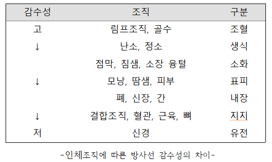 분화한 기능세포인 림프구와 같이 아포토시스 유도기구가 활동하는 세포의 경우는 방사선 감수성이 한층 높아진다. 따라서 인체의 각 장기를 비교해 보면 골수나 림프계 같은 조혈조직의 감수성이 가장 높아서 방사선 장해가 출현하기 쉽다.