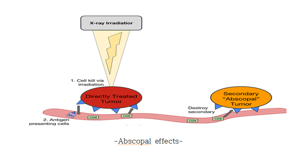 이와 같이 저선량을 조사받으면 T세포는 방사선치료(RT)가 적용되지 않는 원발성 암종에서도 표적화된 반응을 나타낸다. 이러한 효과는 T세포의 활성을 증가시키는 면역치료제를 병용하면 더욱 강화되는데 이러한 전신효과 과정은 종양침윤 림프와 TREX1, KPNA2 및 p53 신호발현 등 암 방사선치료의 예후에 관한 바이오마커로 연구가 진행되고 있다.