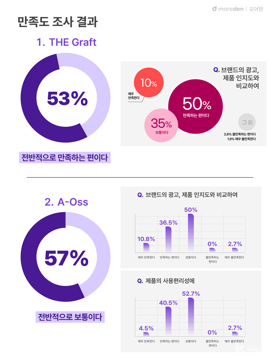 가장 최근, 자주 사용한 1순위 브랜드인 THE Graft는 총 6가지 항목에서 만족하는 편이다 라는 응답이 가장 높게 집계됐다. 특히 브랜드의 광고, 제품 인지도 대비 만족도와 전반적인 만족도 부문에서 각 50%, 52.78%로 사용자 과반수 이상의 유저가 만족하는 것으로 나타났다.