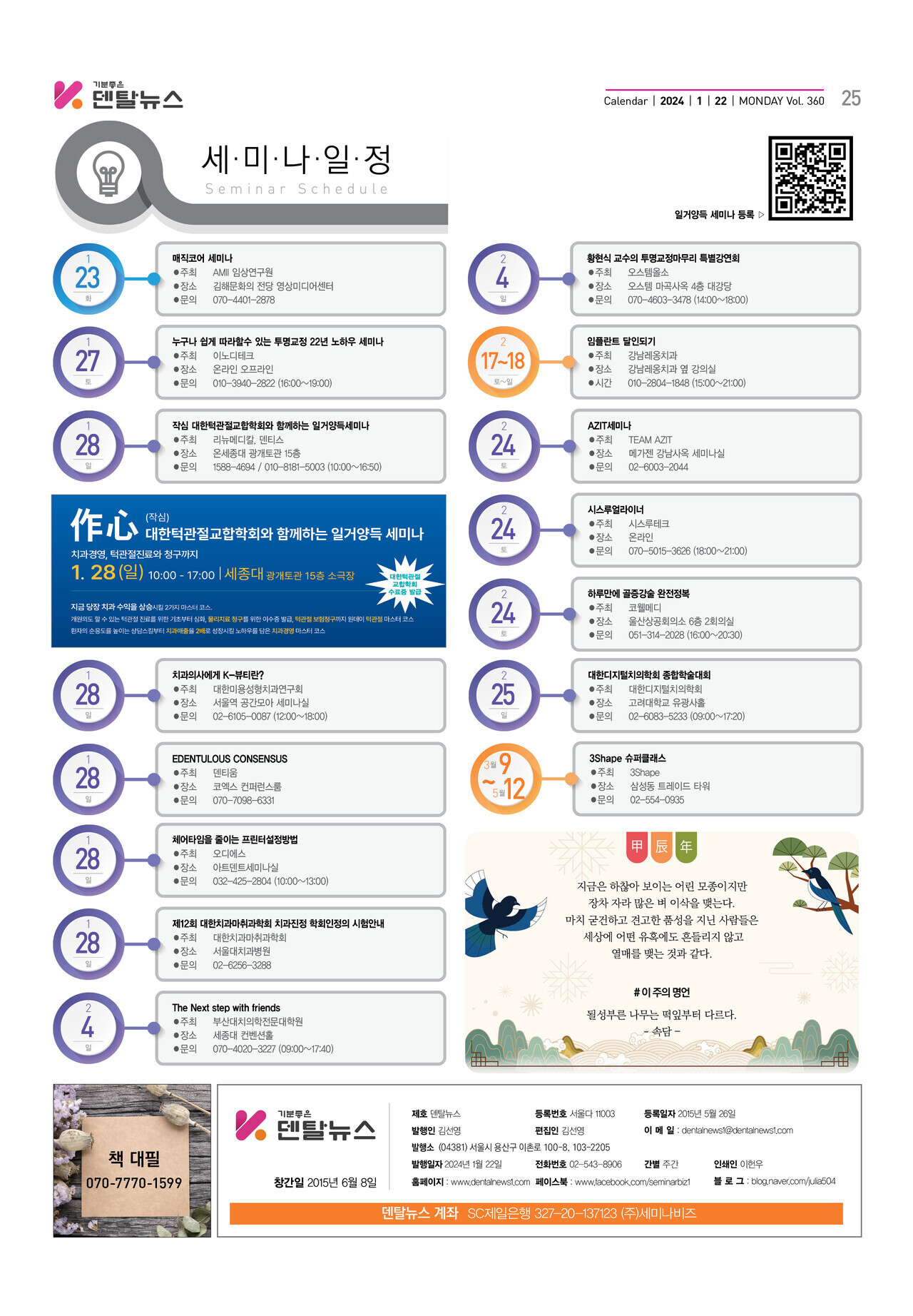 좋아요1훈훈해요0슬퍼요0후속기사 원해요0 키워드 #덴탈뉴스 #매직코어세미나 #투명교정세미나 #작심세미나 #황현식교수 #대한디지털치의학회 #치과의사 덴탈뉴스 webmaster@seminarbiz.kr 다른기사 보기 저작권자 © 덴탈뉴스 무단전재 및 재배포 금지 당신만 안 본 뉴스 [알파베러정재욱대표] 좋은 제품 검증된 제품만 모은 알파베러 유한 evertis 임플란트 성공 위한 워크샵 진행 “미용치과 안티에이징이 치과의 블루오션” 덴탈스튜디오, 블랙니들홀더 출시 서울대학교치과병원, 키르기스스탄 장애 어린이위한 사랑의 의료봉사 펼쳐 연송캠퍼스 개관10주년 기념식 및 SID 명예의 전당 제막식 네오바이오텍, 즉시로딩 임플란트 ALX-IT 11월 세미나 전국 진행 [알파베러정재욱대표] 좋은 제품 검증된 제품만 모은 알파베러 개의 댓글 회원로그인 작성자 비밀번호 댓글 내용입력 댓글 정렬 최신순 추천순 답글순 BEST댓글 BEST 댓글 답글과 추천수를 합산하여 자동으로 노출됩니다. 닫기 더보기 댓글삭제 삭제한 댓글은 다시 복구할 수 없습니다. 그래도 삭제하시겠습니까? 비밀번호 닫기 댓글수정 댓글 수정은 작성 후 1분내에만 가능합니다. 본문 / 400 비밀번호 닫기 내 댓글 모음 닫기 주요기사 중국 의료기기 1등급 인허가 취득 점빵치과 고민! 한자리서 해결 완성도높은 투명교정 솔루션 나노라이너 치과의사들의 만성고민 해결 신경치료가 혈당과 지방대사까지 개선 골이식 전략과 덴티움 제품 활용 노하우 공유