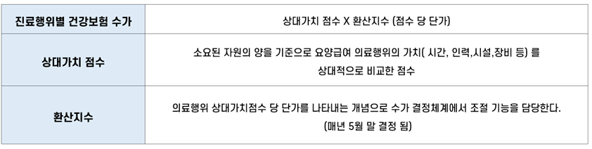 그런데, 기억을 더듬어 보면 학교 다닐 때, 건강 보험학 수업 시간에 우리나라의 진료비 지불 방식에 대해 배우면서 ‘진료 행위별 건강보험 수가’가 상대가치점수와 환산지수에 의해 결정된다는 것을 배웠다.