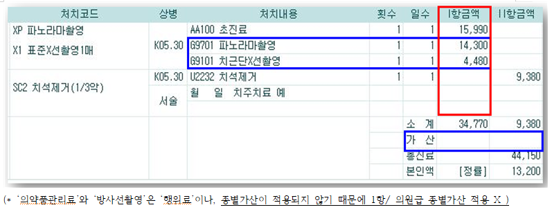 또한 나항의 검체검사, 영상검사나) 행위는 ’24년부터 종별가산을 적용하지 않는다. 따라서 치근단 촬영, 파노라마촬영, 교익촬영, Cone Beam CT 수가에 대해 종별가산이 적용되지 않는다. (출처 :건강보험 심사평가원 )