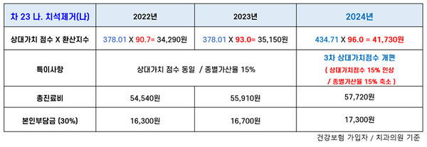 이렇게 결정된 상대가치점수에 환산지수가 곱해지면 ‘행위수가’가 나온다. 예를 들면 초진에 차23 나.치석제거(전악)를 시행하면 2023년도에는 환자 본인부담금이 16,700이고, 올해(2024년)는 17,300원이 된다. 이는 위에서 언급했던 상대가치점수와 환산지수에 의해 수가가 결정되는 것을 표로 정리해 보았다.