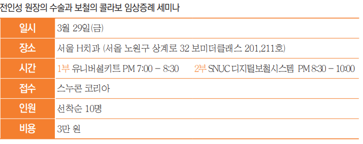 (주)스누콘코리아(대표 고영환)가 오는 3월 29일(금) 전인성(서울 H 치과) 원장 초청 세미나를 개최한다.