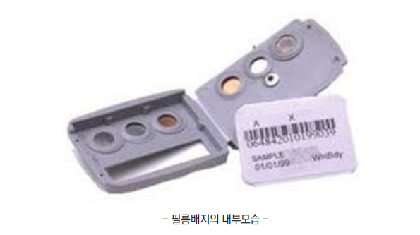 필름배지의 내부에 들어있는 필름은 플라스틱의 양면 또는 한 면에 사진유체가 도포되어 있으며 내부룰 살펴보면, 방사선의 종류나 에너지 판별용 필터와 이들의 케이스로 구성되어 있다.