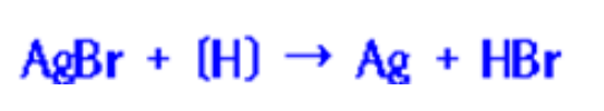 감광된 필름을 환원제인 현상액에 넣으면 AgBr 결정에서 Ag와 분리되어 Br이 이탈한 부분에서부터 현상액의 침투가 일어나고 결정내의 AgBr을 아래와 같은 반응으로 환원하여 은을 응고시킨다.