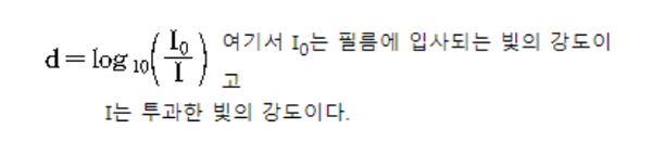 필름의 흑화도(d)는 다음의 식으로 나타나며 밀도계(densitometer)를 이용하여 측정한다.