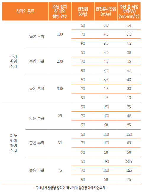 작업부하(w)는 X선관의 사용 정도를 나타내는 수치로서 지정된 기간 동안 얼마나 X선관에 얼마나 많은 부하를 주었는지를 나타내 준다. 이는 X선관전류와 조사시간, 그리고 주당 총 환자 수의 곱으로 구할 수 있다. 치과방사선 방어시설의 작업부하 량은 구내촬영 장치와 파노라마촬영 장치로 나누어 제시되며 다음 표에 나타난 값이 적용된다.