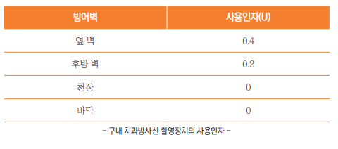 치과방사선 방어시설에서의 사용인자는 작업부하 중에 방어벽에 X선이 향하고 있는 비율이다. 즉 촬영장치가 특정 방어벽을 향해 조사되는 X선 선량을 말하며 구내촬영 장치에는 아래의 표와 같은 비율이 적용된다.