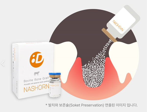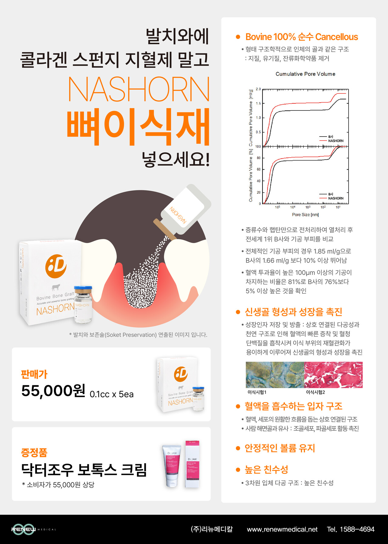 이번에 런칭한 나스호른 0.1cc는 높은 친수성을 지녀 신생골 형성과 성장을 촉진하는 다공성 천연구조를 가진 골이식재로 전세계 1위 골이식재와 비교해보아도 손색없는 제품이다. 또한 3차원 입체 다공구조로 친수성이 높고 혈액과 세포의 원활한 흐름을 돕는 상호 연결된주고가 특징이다. 뿐만아니라 사람해면골과 유사해 조골세포와 파골세로 활동을 촉진한다.