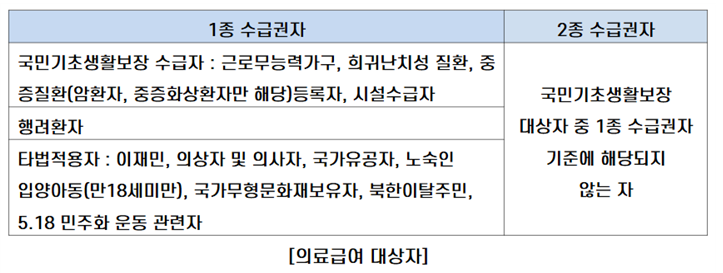 의료급여법 시행령 제3조 제2항의 규정에 의하여 1종 수급권자와 2종 수급권자로 구분한다.