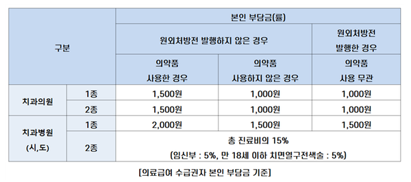 자격증을 따기 위해서 열심히 외웠던 표이다. 하지만 실제 임상에서 이 표를 보고 환자에게 본인부담금을 1,000원 또는 1,500원을 현금이나 카드로 징수해서는 안 된다.