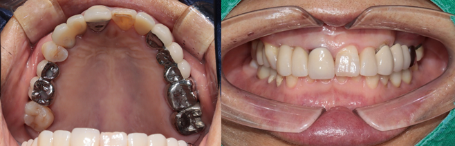 전치부는 지르코니아, 구치부는 보험임플란트 pfm 으로 제작 (70세 여자)