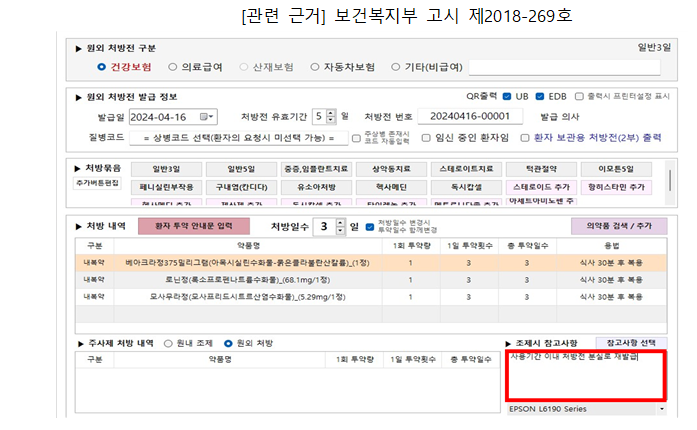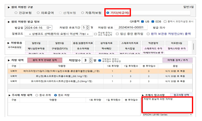 ■ 약을 분실하여 처방전 재발급 시: 이미 수령한 약제를 분실한 것은 환자에게 귀책사유가 있으므로 진찰료 및 약국에서의 약재료, 조제료는 모두 전액 본인이 부담하도록 하고 요양급여비용은 청구할 수 없다. 이 경우 처방전 양식 중 ‘기타’란에 ‘전액 본인 부담’으로, ‘조제 시 참고사항’란에 재처방 사유(예: 처방약 분실에 의한 재처방)를 기재하여야 한다.