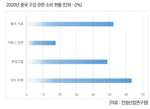 가까운 중국의 경우는 어떨까? 중국의 경우도 소득이 상승에 따라, 구강 건강에 대한 관심도 증가하고 있다. 2020년 중국 구강 의료산업 보고서에 따르면, 구강 산업 성장률은 미국의 6배이며, 중국의 구강 산업 소비 증가율은 전세계에서 가장 높았다. 구강 건강 관련 1인 지출 비용이 2000위안을 넘어서는 한국과 미국에 비해 중국은 136 위안으로 아직 그 규모가 크다고 할 수는 없다. 하지만, 중국의 방대한 인구와 경제 성장률에 미루어 보았을 때, 중국의 구강 산업 성장 가능성은 매우 높다고 할 수 있다.