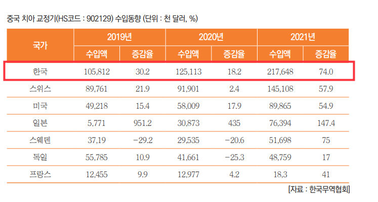 중국의 치아 교정기에 대한 주 수입 국가는 한국, 스위스, 미국 순이다. 세 나라 모두 꾸준한 증가세를 보이고 있으며, 2021년에 한국은 74%증가했다. 또한, 3년 연속 한국 수입액이 모든 나라에서 1위를 차지했다.