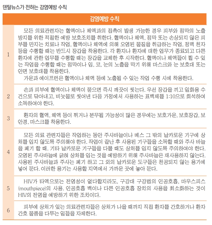 체계적인 교육과 홍보의 부재는 그 심각성의 인식이 아직도 부족하다. 이미 진료 중 의료진이 감염된 사례가 수회 보고된 바 있다. 치과 진료의 모든 측면들을 감염방지계획의 목표로 설정하고 기존의 진료체계 및 술식을 검토하여 제도의 개선을 포함한 변화 와 투자로 감염방지 체계를 확립해야 한다.