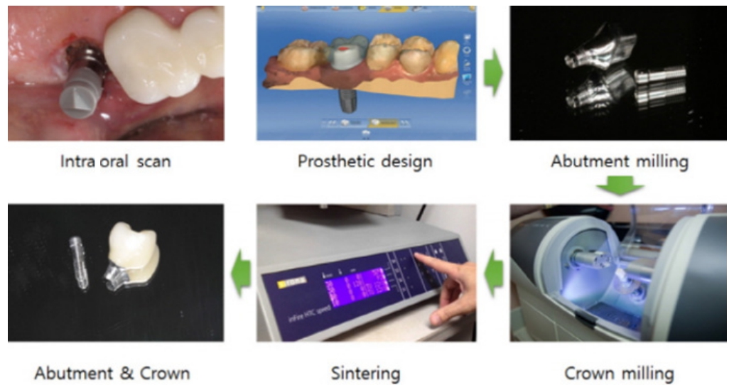 △ (그림 11-2) Work flow of dental prosthetic fabrication using Intra-oral Scanner and Milling machine and Sintering system Kwon-Soo et al : Implant Digital Impression with Intra Oral Scaners : A Literature Review. Implantology. 2017.