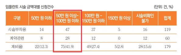 최근 3년간 임플란트 시술 금액대별 시술 부작용 및 계약 관련 피해구제 신청 건을 분석한 결과, ‘50만 원 초과~100만 원 이하’가 41.9%(75건)로 가장 많았고, ‘100만 원 초과~150만 원 이하’ 27.4%(49건), ‘50만 원 이하’ 12.3%(22건), ‘150만 원 초과‘ 2.8%(5건) 순으로 나타났다.
