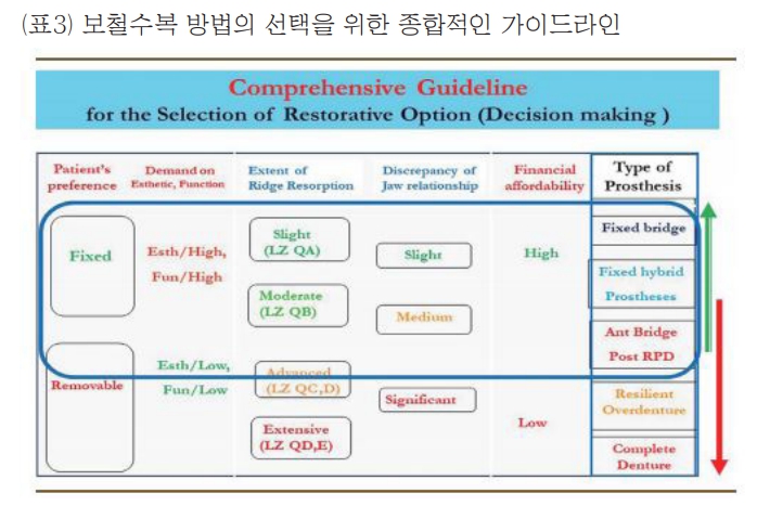 치과보철수복 방법의 선택을 위한 (표 3)의 가이드라인에 따라 본 환자의 선호도와 심미적인 그리고 기능적인 요구, 해부학적인 고려사항,경제적인 부담능력에 따라 아래와 같이 치료계획을 선택하였다.