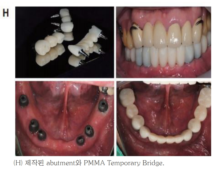 일반적으로 single crown이나 적은 수의 임플란트 보철물은 Intraoral scanner에 의해 임시보철물, 최종보철물을 위한 digitlal impression을 할 수도 있으나 여러 개의 임플란트지지 보철물이나 Span이 긴 보철물일 경우에는 기존의 인상채득 방법에 의한 cast가 요구될 수 있다. 2개월 후에 인상채득하고 mounting jig를 이용하여 교합기에 모형을 mounting 한 후 Zirconia 최종보철물에 의한 치과보철수복을 하였다.