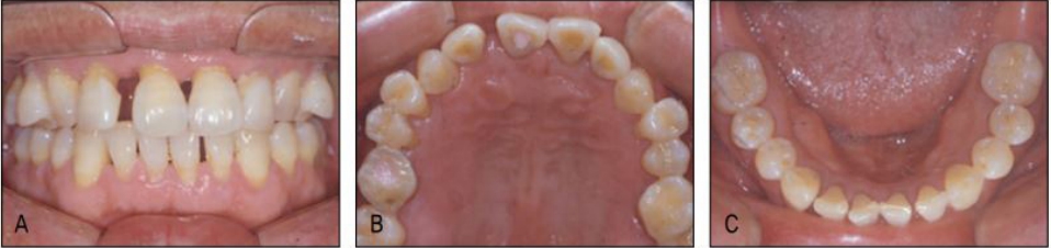 치주질환이 있게 되면 염증에 의한 치주인대강내 압력으로 인해 치아는 정출하게 된다. 동요도가 증가한 상태에서 anterior component of force 등의 이유로 치아는 전방으로 돌출하는 식으로 치아변위가 나타난다. 자연 치간공간이 생기면서 심한 비심미적 상태가 초래된다. 전방으로 돌출된 치아를 원래 위치로 돌려주는 교정치료가 필요한데, 전치부 뿐 아니라 구치부에서의 골상실도 있으므로 구치부 앵커 보강을 위해 passive wire를 본딩하여 스플린팅을 도모한다. 와이어는 작은 크기를 사용하여 약한 힘을 낼 수 있도록 하며, 전치 후방이동을 위한 고무체인 또한 약한 힘을 내는 특별한 체인을 사용하는 배려가 필요하다.